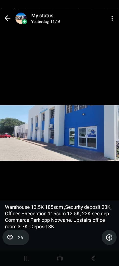 Warehouse and office available 185sqm warehouse 13.5k and 115sqm offices(3 nos.+reception)12.5k commerce Park in front of Notwane Eggs